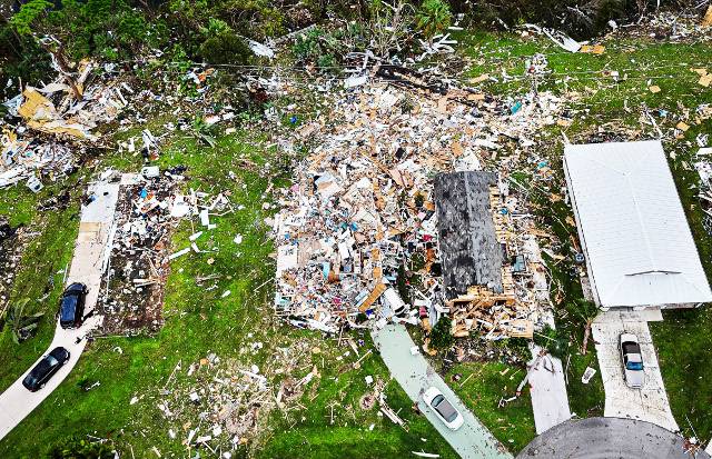 허리케인 '밀턴'이 휩쓸고 간 11일(현지시간) 미국 플로리다주 포트세인트루시의 주택 등이 산산이 부서져 있다. 플로리다를 관통한 밀턴은 시속 195㎞에 달하는 강풍과 기록적인 폭우로 곳곳에 큰 피해를 남겼다. 사망자는 최소 17명으로 집계됐다.