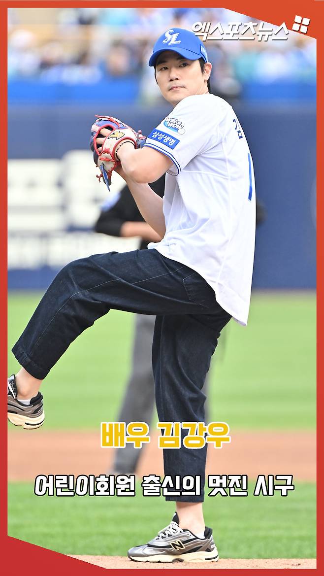 (엑스포츠뉴스 대구, 김한준 기자) 13일 오후 대구삼성라이온즈파크에서 열린 '2024 신한 SOL Bank KBO 포스트시즌' LG 트윈스와 삼성 라이온즈의 플레이오프 1차전 경기, 경기 전 '삼성 어린이회원 출신' 배우 김강우가 시구에 임하고 있다.