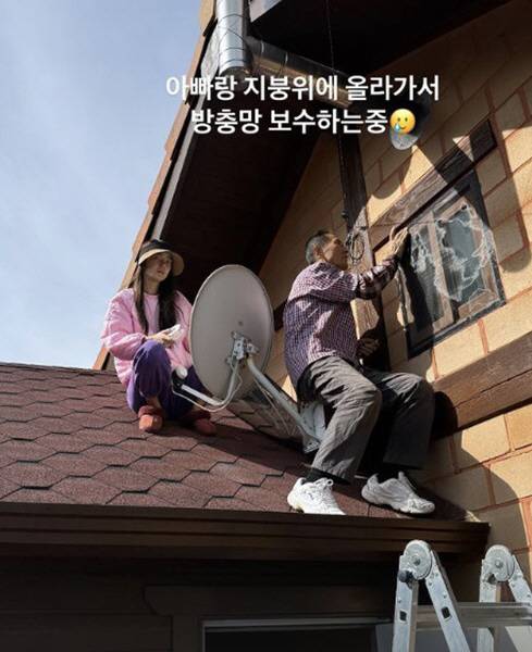 서효림은 "아빠랑 지붕 위에 올라가서 방충망 보수하는 중"이라며 사진을 공개했다.