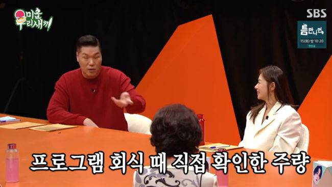 그러면서 자연스럽게 부모님에 대해언급, 유일한 잔소리에 대해선 "술 좀 작작 마시라고 하신다"며 털털하게 말해 웃음을 안겼다. 실제 주량이을 묻자 장신영은 "예전에 좀 마셨던 거 같아 소주 한 두~세병"이라 했고, 친분이 있는 서장훈은 "그 정도 수준 아니다, 예전에 프로그램 회실할 때 주량 확인했다"며 "주량보고 놀랐다"고 했다.