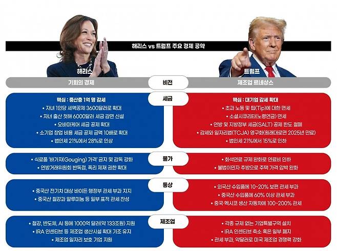 해리스는 중산층을 중심으로 한 ‘기회의 경제’를, 트럼프는 제조업 부흥을 앞세운 ‘신(新)산업주의’를 내세우고 있다.