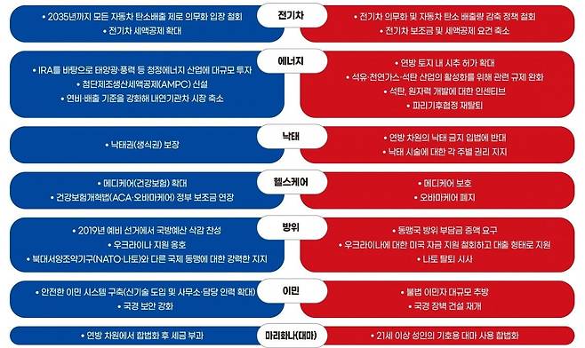 하지만 경합주(스윙스테이트)에서 치열한 접전이 벌어지자 입장을 틀었다. 자동차와 전통 제조업이 자리 잡은 러스트벨트의 표심으로 당선이 좌우될 수 있는 만큼 해리스는 “전기차 의무화를 지지하지 않는다”며 한발 물러섰다. 하지만 에너지 정책의 큰 줄기는 탄소 배출량을 줄이고 재생에너지를 육성하는 친환경 기조를 유지하고 있다.