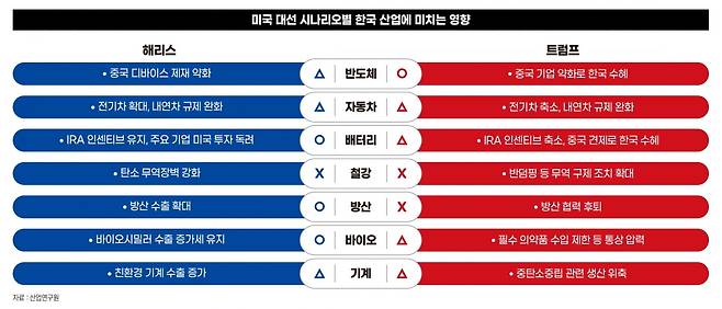 미국의 노골적인 자국 우선주의가 강화되면서 한국의 셈법은 복잡해지고 있다. 반도체, 전기차, 배터리, 방위산업 등 제조업 수출을 토대로 성장한 우리 기업들은 두 후보의 정책 변화와 규제에 촉각을 곤두세우고 있다.