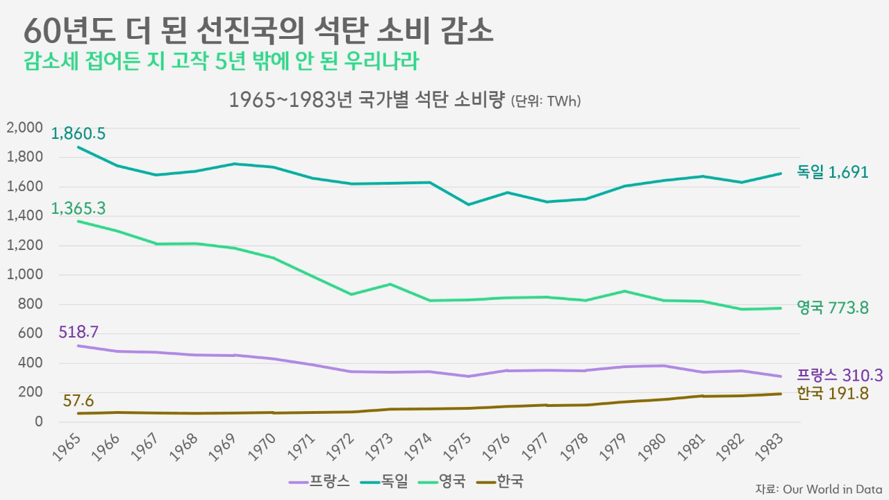 주유종탄은 더 나은 효율로의 에너지전환 정책이기도 합니다. 당시 환경적 요소까지 깊이 고려할 상황은 아니었지만, 고효율 연료로의 전환은 대기오염물질과 온실가스의 감소를 부르는 에너지전환이기도 했죠. 그런데, 이러한 정책의 흐름과 그 흐름을 담은 사료(史料)와는 달리, 우리나라의 실질적인 석탄 소비량은 늘어만 갔습니다. 아무리 주유종탄으로의 전환 직후 오일쇼크로 다시 주탄종유 기조로 회귀를 했다고 하더라도, 더 이상 국내에서 석탄 생산을 하지 않음에도 우리의 석탄 소비는 전혀 줄어들지 않았죠. 우리의 선택이, 행동이 얼마나 문제였는지는 한국과 영국, 독일, 프랑스의 1965년 이래 석탄 소비량 통계를 통해 확연히 드러납니다.