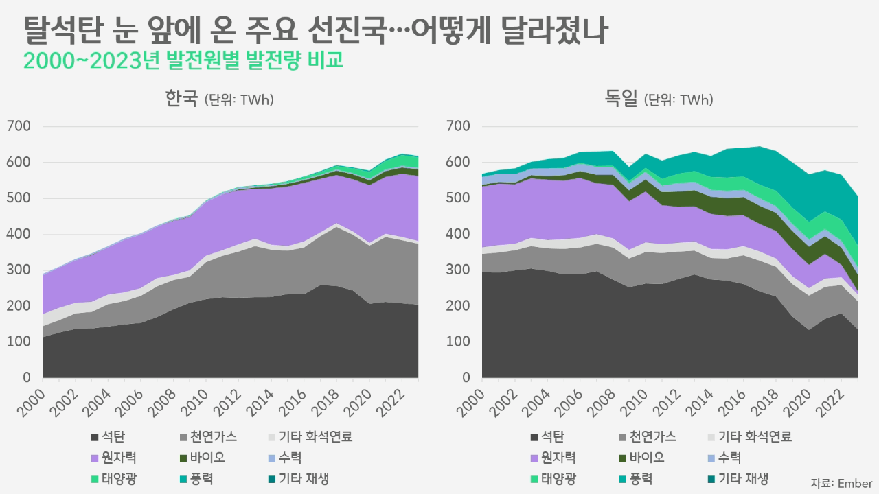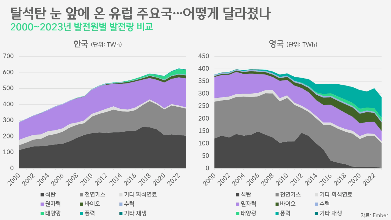 당장 발전부문의 탈석탄을 완성한 영국과 탈석탄을 목전에 둔 프랑스와는 정반대의 모습입니다. 영국의 발전량은 2000년 377.06TWh에서 2023년 285.92TWh로 프랑스의 발전량은 2000년 532.56TWh에서 2023년 514.1TWh로 줄었습니다. 그렇게 전력 생산 자체를 줄여오면서 재생에너지의 발전 비중은 영국(2000년 2.6% → 2023년 47.3%), 프랑스(2000년 12.7% → 2023년 26.3%) 모두 늘려왔고요. 영국은 전력부문의 탈탄소를 재생에너지 확대로 달성해가는 중이고, 이미 원자력발전을 중심으로 전력의 탈탄소를 상당 수준 이뤄냈던 프랑스 또한 그 누구보다 앞서 재생에너지 확산에 박차를 가해온 것입니다.
