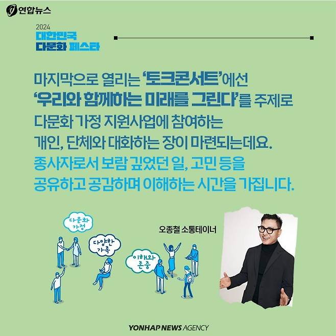 마지막으로 열리는 '토크콘서트'에선 '우리와 함께하는 미래를 그린다'를 주제로 다문화 가정 지원사업에 참여하는 개인, 단체와 대화하는 장이 마련되는데요. 종사자로서 보람 깊었던 일, 고민 등을 공유하고 공감하며 이해하는 시간을 가집니다.