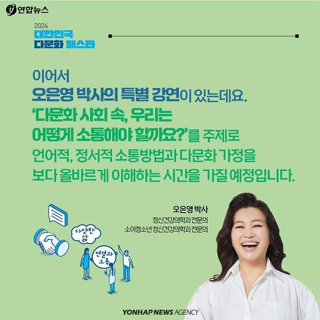 이어서 오은영 박사의 특별 강연이 있는데요. '다문화 사회 속, 우리는 어떻게 소통해야 할까요?' 를 주제로 언어적, 정서적 소통 방법과 다문화 가정을 보다 올바르게 이해하는 시간을 가질 예정입니다.