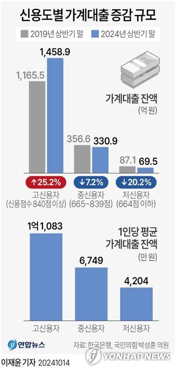 (서울=연합뉴스) 이재윤 기자 = 14일 국회 기획재정위원회 소속 국민의힘 박성훈 의원이 한국은행에서 제출받은 자료에 따르면, 최근 가계대출이 신용 점수가 높은 차주를 중심으로 증가하고 있다는 분석이 나왔다. 신용도가 높을수록 가계대출 증가세도 가팔랐다.