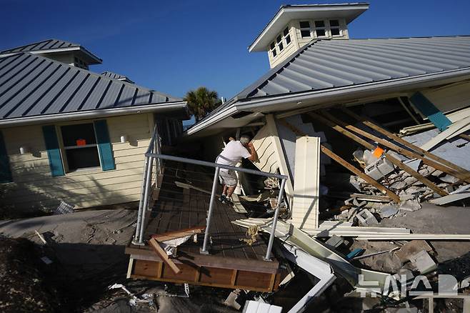 [잉글우드=AP/뉴시스] 13일(현지시각) 미 플로리다주 잉글우드 마나소타 키의 한 주민이 아내와 함께 지내다 허리케인 밀턴으로 파괴된 주택 잔해 2층을 들여다보고 있다. 2024.10.14.