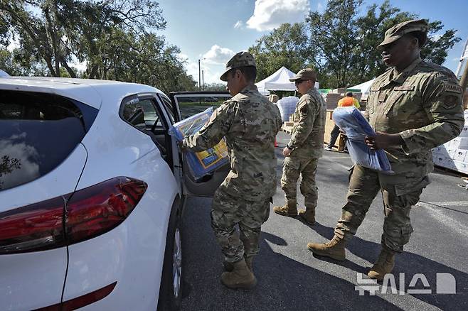 [브랜던=AP/뉴시스] 13일(현지시각) 미 플로리다주 브랜던에서 플로리다주 방위군 대원들이 허리케인 밀턴으로 집을 잃은 주민들의 차에 구호 물품을 전달하고 있다. 2024.10.14.