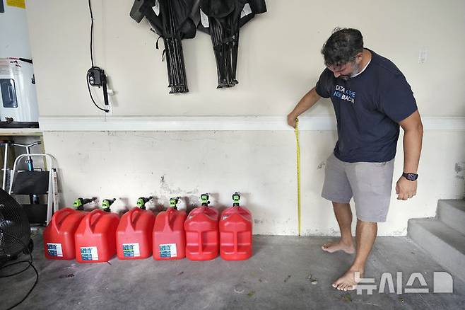 [탬파=AP/뉴시스] 13일(현지시각) 미 플로리다주 탬파에서 한 주민이 허리케인 밀턴으로 침수됐던 자택 차고의 수위를 보여주고 있다. 2024.10.14.