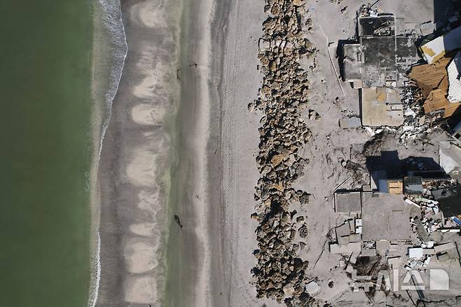 [잉글우드=AP/뉴시스] 13일(현지시각) 미 플로리다주 잉글우드 마나소타 키에 허리케인 밀턴이 지나간 후 잔해로 남아 있는 빈집 앞으로 파도가 밀려오고 있다. 2024.10.14.