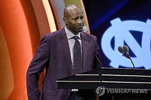 Vince Carter reacts while talking about his mother during his enshrinement in the Basketball Hall of Fame, Sunday Oct. 13, 2024, in Springfield, Mass. (AP Photo/Jessica Hill)