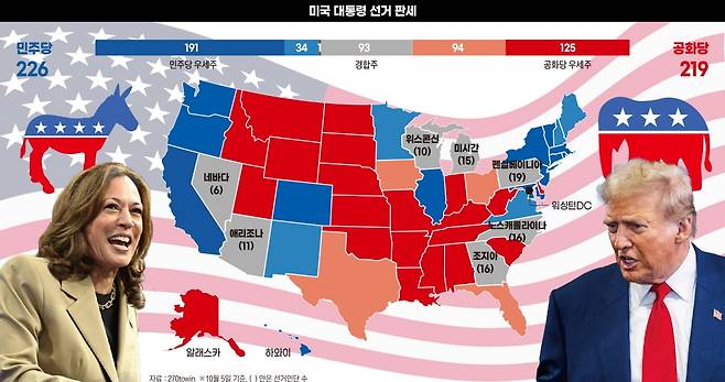 아직 표심을 정하지 않은 경합주가 승자를 결정하는 구조다. 파이낸셜타임스가 여론조사 평균을 분석한 결과 7개 경합주에서는 평균 1.5%p 이내의 숨막히는 접전이 벌어지고 있다. 미 ABC 방송과 여론조사기관 입소스가 지난 4∼8일 진행한 조사에서는 두 후보의 지지율이 경합주에서 49%로 같았다.