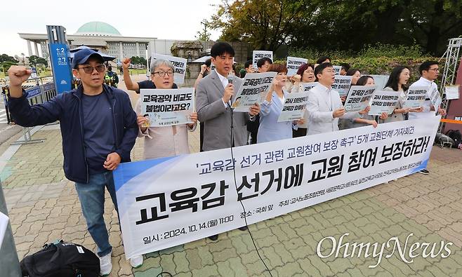 5개 교원단체(전국교직원노동조합, 교사노동조합연맹, 새로운학교네트워크, 실천교육교사모임, 좋은교사운동) 주최로 14일 오전 서울 영등포구 국회 앞에서 열린 '교육감 선거 관련 교원 참여 보장 촉구 공동 기자회견'에서 각 단체 대표자들이 "교원 정치기본권 보장 법안 통과 및 교원의 교육감 선거 참여 보장"을 촉구했다.