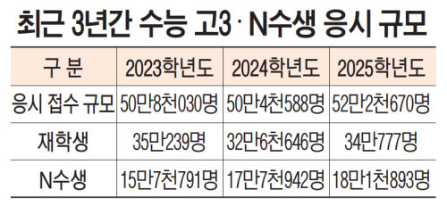 재수생 역시 2021학년도 수능에서 4만6천800여명을 기록하며 저점을 찍은 이후 4년 연속 증가, 올해는 5만8천600명으로 최고치를 경신했다.
