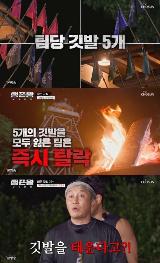 특히 제작진은 2개의 깃발을 태우라고 말했고, 결국 정글팀은 피지컬팀과 국가대표팀의 깃발을 불길 속에 넣었다.