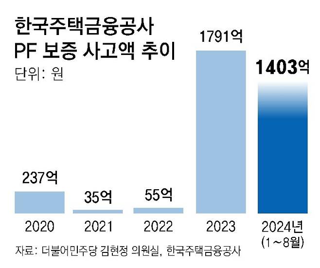 PF 보증이란 건설사 등 주택 사업자가 주택을 짓는 데 필요한 자금을 대출받는 과정에서 주금공이 제공하는 보증 상품이다. 주금공은 △대출 원리금 미상환 △주택사업자 파산 및 회생 △장기 공사 중단 등의 사고 발생 시 해당 사업장이 빌린 돈의 70∼80%를 금융기관에 대신 갚아준다.