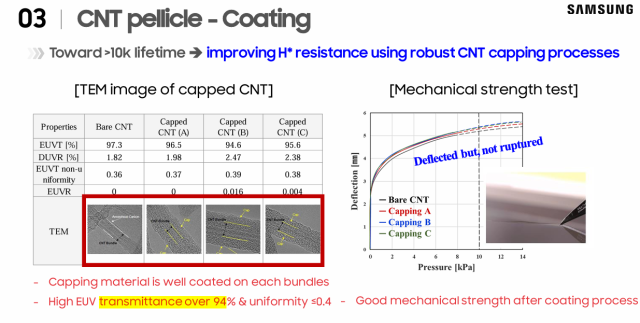 기존에는 일본 미쓰이화학의 펠리클을 파운드리 공정에 소량 적용했었는데 CNT 제품의 경우 국내 소재 기업인 에프에스티와 '캐핑(Capping) CTN 펠리클'이라는 기술을 협력 개발해 수명을 20배나 더 늘렸다고도 소개했다.