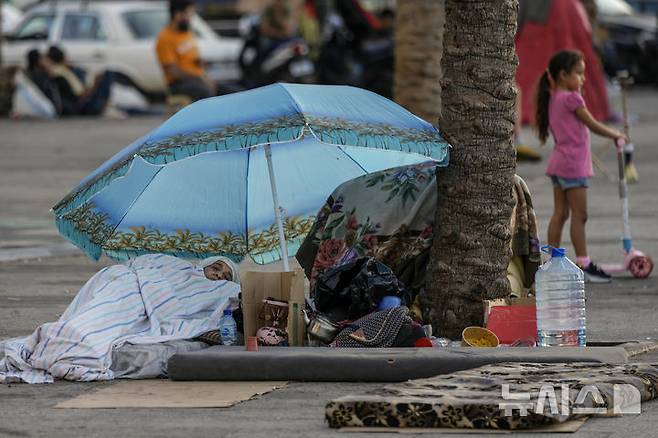 [베이루트=AP/뉴시스] 14일(현지시각) 레바논 다히예 지역에서 이스라엘의 공습을 피해 대피한 한 여성이 베이루트 해변 산책로에서 잠자고 있다. 2024.10.15.