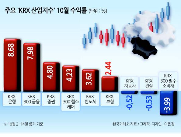 15일 한국거래소가 도출한 29개 ‘KRX 산업지수’ 가운데 10월(2~14일) 수익률 ‘톱 3’ 자리는 ‘KRX 은행(8.68%)’, ‘KRX 300 금융(7.98%)’, ‘KRX 증권(4.80%)’ 지수가 차례로 차지한 것으로 나타났다. ‘KRX 보험(2.44%)’ 지수는 등락률 9위 자리에 이름을 올려며 상위권 한 자리를 차지했다.