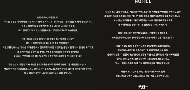 이어 "이러한 과정 속에서 미발매 음원에 관하여 전 소속사 및 동료에 대한 도의적 차원에서의 검토도 무의미하다고 판단해 '공동 저작자인 제가 원하지 않는 형태로는 어디에도 미발매곡이 쓰이는 것을 원하지 않는다'라는 내용의 메일을 현재 회사를 통해 보냈다. 그럼에도 불구하고 몇 차례 저의 저작물이라 할 수 있는 음악이 재구성되지 않은 채 공연됐고, 관련하여 특정 조치를 취하기 위해 최근 이와 관련한 공지를 올렸다"고 전했다.