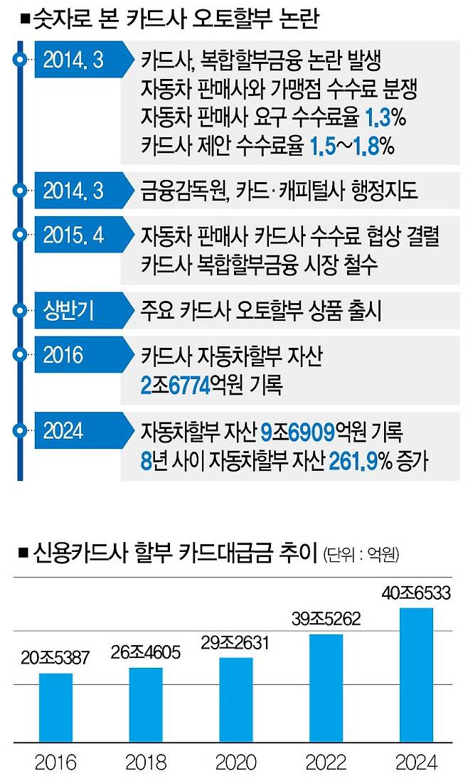 문제는 카드사의 오토할부가 금융감독원의 행정지도를 무시한 '편법 상품'이라는 거다. 금감원이 여신전문업체(카드사·캐피털사)를 대상으로 행정지도에 나선 건 지금으로부터 10년 전인 2014년 8월이었다. 발단은 자동차 판매사와 카드사 사이에서 벌어진 가맹점 수수료율 논란이었다. 그렇다면 어떤 논란이 있었기에 금융당국이 카드사에 행정지도까지 내렸던 걸까. 시계추를 2014년으로 돌려보자.