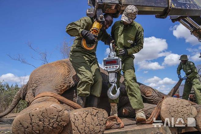14일(현지시각) 케냐 나이로비 동쪽의 무웨아 국립공원에서 케냐 야생동물 서비스 소속 관리원들과 포획팀이 마취한 코끼리 무게를 측정하고 있다.