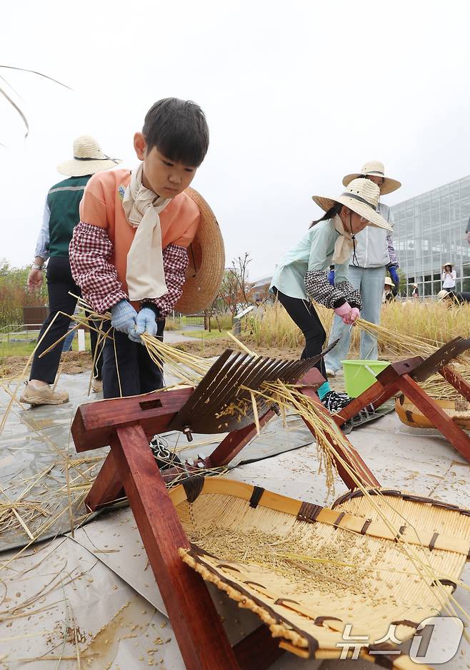 (수원=뉴스1) 김영운 기자 = 15일 경기 수원시 권선구 국립농업박물관에서 열린 벼베기 체험행사에서 아이들이 홀테를 이용해 벼를 탈곡하고 있다. 2024.10.15/뉴스1