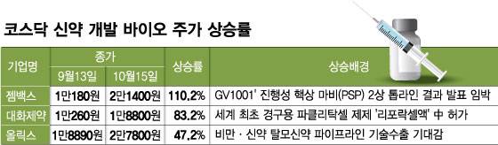 15일 업계에 따르면 최근 한달 간(9월13일~10월15일) 코스닥 상장 바이오 기업 중 주가 상승률 상위 4개사 중 3개사(젬백스, 대화제약, 올릭스)가 신약 개발사였다. 보유한 신약 파이프라인의 주요 임상 결과 발표 임박과 기술 수출 기대감, 해외 허가 성과 등이 반영된 결과다.