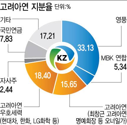 15일 업계에 따르면 MBK 연합과 최윤범 고려아연 회장 측은 주총 표 대결을 대비해 다양한 경우의 수를 계산 중인 것으로 알려졌다. 전날(14일) MBK 연합이 공개매수 종료와 함께 최 회장 측 지분율(34.05%·우호지분 포함)을 4.42%포인트 차이로 따돌리며 양자 간 대결에선 우세한 상황을 점했다. 여기에 최 회장 측이 자사주 공개매수 목표 예정 수량인 20%(자사주 17.5%·베인캐피탈 펀드 2.25%)를 모두 확보한다면 오히려 MBK 연합의 의결권 환산 지분율은 과반에 가까워진다. MBK 연합이 장내매수를 통해 2~3%만 확보할 경우 단독으로 과반을 확보할 수도 있다.