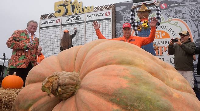 14일 미국 캘리포니아주 하프문베이에서 열린 ‘가장 큰 호박 선발대회’의 우승자인 트래비스 진저 씨(오른쪽에서 두 번째)가 자신의 호박 앞에서 두 팔을 들어 환호하고 있다. 그의 호박 무게는 2471파운드(약 1121kg)에 달한다. 1등에게 호박 1파운드당 9달러의 상금이 수여되므로 그는 3000만 원이 넘는 상금을 받을 수 있다. 해당 호박은 조각가들의 손을 거쳐 올해 ‘핼러윈’ 행사에 전시된다.