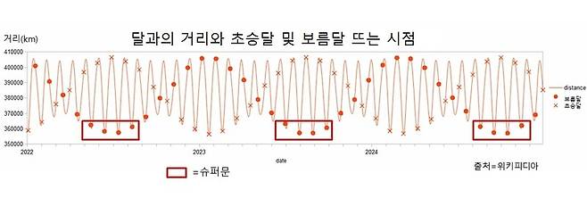 이번에 뜨는 슈퍼문은 올해 가장 작은 보름달이었던 2월24일 정월대보름의 둥근달보다 겉보기 크기가 약 14% 크다. 2월 보름달의 거리는 40만5900km였다.