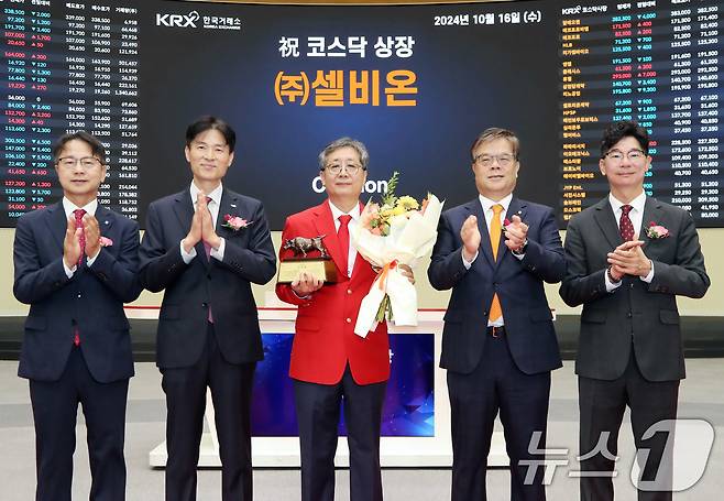 (서울=뉴스1) = 16일 오전 서울 영등포구 한국거래소에서 열린 '셀비온 코스닥시장 상장기념식'에서 상장기념패 전달 후 김대영 한국IR협의회 부회장(왼쪽부터), 민경욱 한국거래소 코스닥시장본부장, 김권 셀비온 대표이사, 오익근 대신증권 대표이사, 김준만 코스닥협회 상무가 기념촬영을 하고 있다. (한국거래소 제공) 2024.10.16/뉴스1