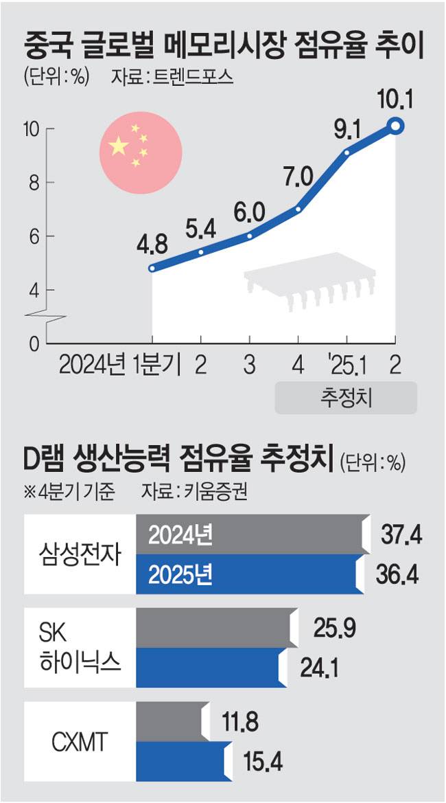 자동차·전자제품 등에 쓰이는 레거시(구형) 반도체 생산량을 확대하며 세계 시장 장악력을 높이면서 한국 반도체의 전유물로 여겨져 온 메모리 반도체 시장에 '중국발 경고음'이 커지고 있다.