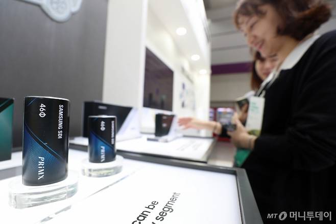 16일 서울 강남구 코엑스에서 열린 '그린비즈니스위크 2024'에 설치된 삼성SDI 부스를 관람객이 개발중인 전기차 배터리의 모습을 살펴보고 있다.