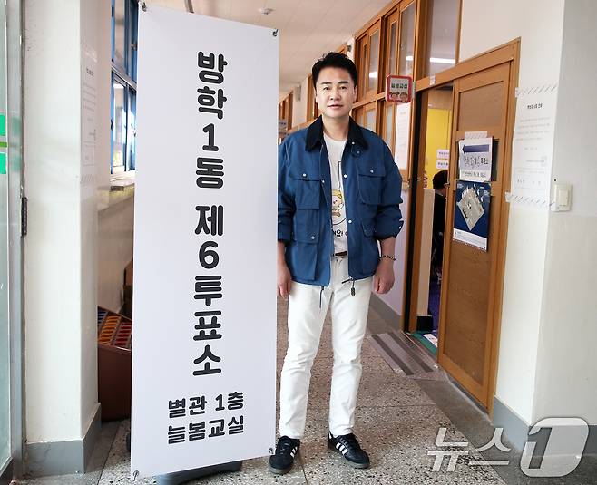 (서울=뉴스1) = 오언석 서울 도봉구청장이 10·16 재·보궐선거 투표일인 16일 서울 도봉구 방학1동 제6투표소에서 투표 후 기념촬영을 하고 있다. (도봉구청 제공) 2024.10.16/뉴스1