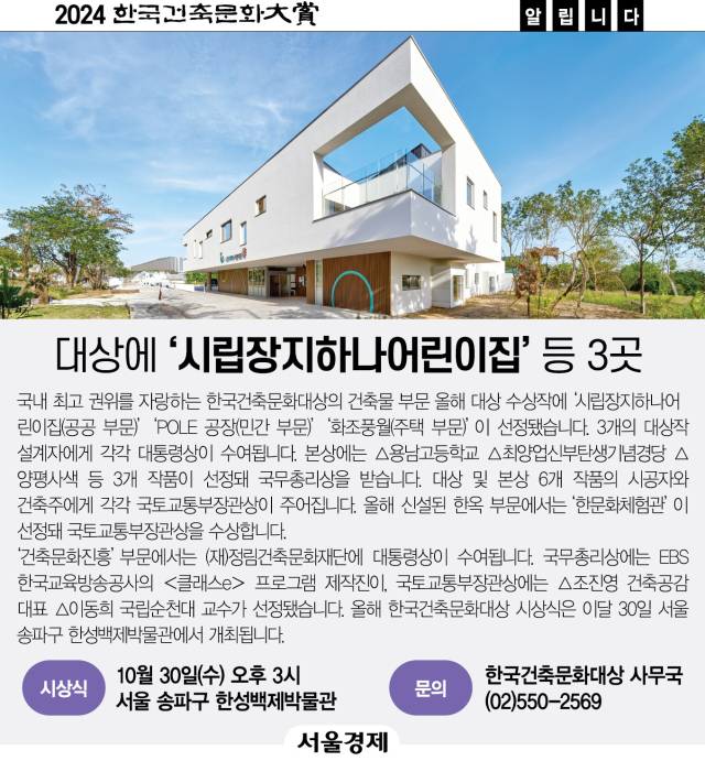 국내 최고 권위를 자랑하는 한국건축문화대상의 건축물 부문 올해 대상 수상작에 ‘시립장지하나어린이집(공공 부문)’ ‘POLE 공장(민간 부문)’ ‘화조풍월(주택 부문)’이 선정됐습니다. 3개의 대상작 설계자에게 각각 대통령상이 수여됩니다. 본상에는 △용남고등학교 △최양업신부탄생기념경당 △양평사색 등 3개 작품이 선정돼 국무총리상을 받습니다. 대상 및 본상 6개 작품의 시공자와 건축주에게 각각 국토교통부장관상이 주어집니다. 올해 신설된 한옥 부문에서는 ‘한문화체험관’이 선정돼 국토교통부장관상을 수상합니다.