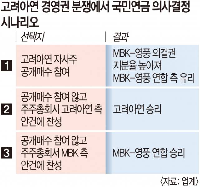 고려아연 지분 7.86%(2분기 말 기준)를 보유한 국민연금이 이달 23일까지 예정된 고려아연 자사주 공개매수에 참여하느냐에 따라 MBK파트너스-영풍 연합 측과 최윤범 고려아연 회장의 희비가 엇갈리게 된다.