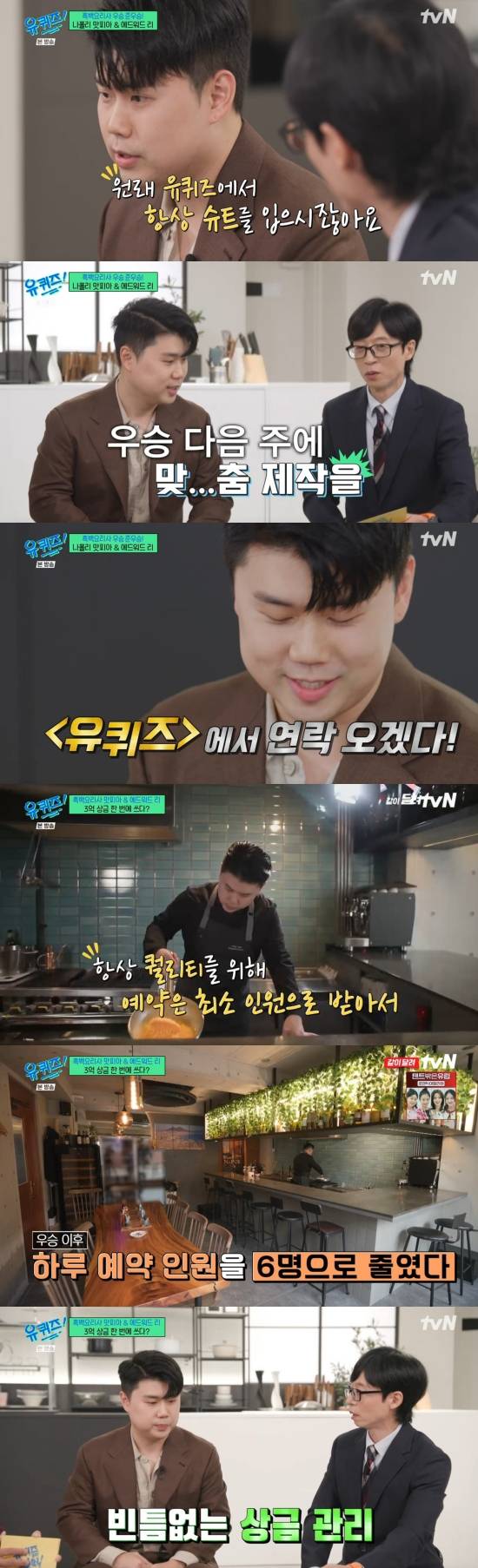 유재석은 "방송 섭외가 엄청날 거 같다"라며 물었고, 나폴리 맛피아는 "딱 나가고 싶은 건 하나밖에 없었다. 부끄러운 이야기이긴 한데 '유퀴즈'에서 항상 슈트를 입지 않냐. 우승을 하고 나서 맞춤 제작을 의뢰를 했다"라며 털어놨고, 유재석은 "'흑백요리사'를 찍었던 카메라팀이 우리 '유퀴즈' 카메라팀이었다"라며 거들었다.