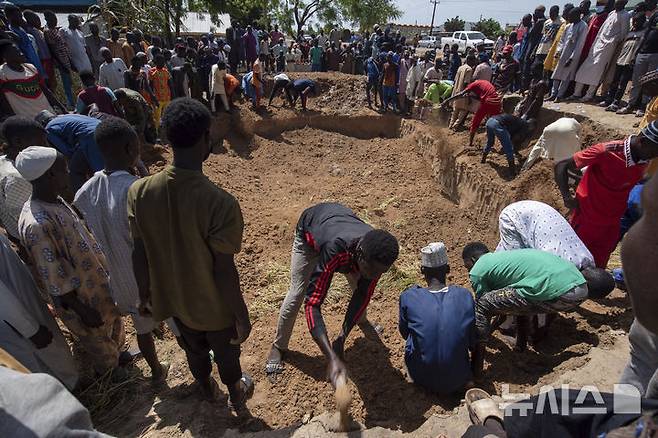 [카노=AP/뉴시스] 16일(현지시각) 나이지리아 지가와주 마지야 마을 주민들이 유조차 폭발 사고 희생자들의 시신을 집단 매장하고 있다. 현지 경찰은 앞서 이 마을에서 전복한 유조차에 주민들이 몰려들어 기름을 퍼내려다가 유조차가 폭발하면서 100명 이상이 숨지고 50명이 다쳤다고 전했다. 2024.10.17.
