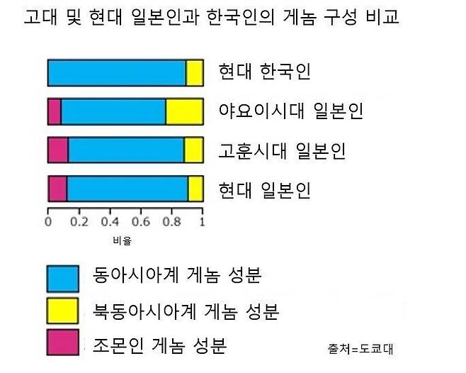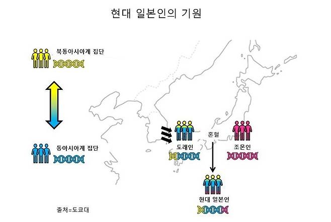 연구진이 제시한 가장 가능성이 높은 시나리오를 요약하면 이렇다. “동아시아 및 동북아시아 계열 게놈을 모두 갖고 있는 한반도인이 야요이시대부터 고훈시대까지 일본 열도로 지속적으로 건너왔다. 이들은 토착 조몬인들과 혼혈했고, 현대 일본인은 이 혼혈인들의 후손이다.”
