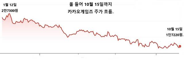 반면 카카오게임즈 주가는 내리 하락 중이다. 3분기 실적 전망도 어두워 증권가에선 카카오게임즈 목표주가를 내려 잡는 상황이다.