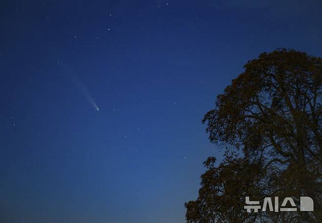 [리에첸=AP/뉴시스] 16일(현지시각) 독일 리에첸 상공에 혜성 'C/2023 A3'(쯔진산-아틀라스 혜성)가 지나가고 있다. 올해 혜성 중 가장 밝은 것으로 꼽히는 이 혜성은 지난해 1월 중국 쯔진산 천문대에서 처음 발견된 이후, 남아공 서덜랜드 천문대의 소행성 탐색 프로그램 아틀라스(ATLAS)에서 다시 확인돼 '쯔진산-아틀라스 혜성'이라는 이름이 붙었다. 2024.10.17.