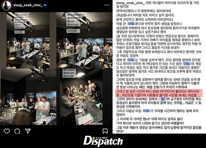 최동석은 2024년 2월, SNS에 "아들 생일에 꼭 그 자리(행사)에 갔어야 했니?"라고 지적했다.