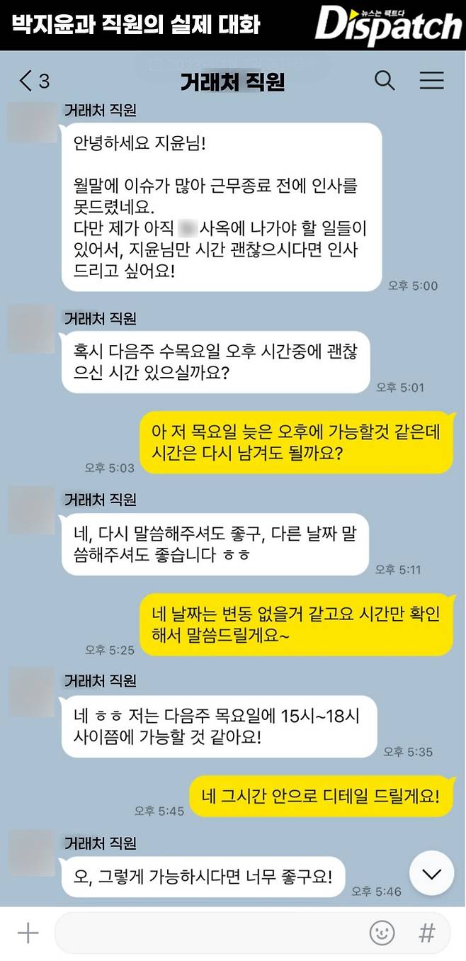박지윤 : 그건 거기가 내 거래처인지 거래처 대표님 초대를 받아서 갔는지 앞뒤 상황을 모르는 후배가 넘겨짚은 거 아니야. 그러면 '공구하는 거래처 오픈식인데 갔나 보다' 그 후배한테 그렇게 얘기 못해?