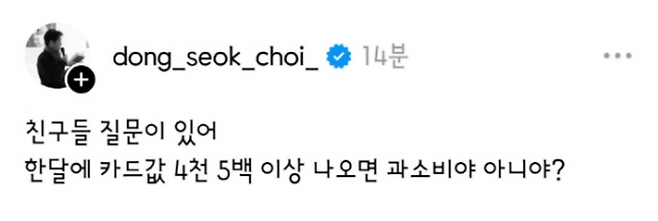 최동석이 SNS 친구들에게 질문했다. "한 달에 카드값 4천 5백 이상 나오면 과소비 아니냐?"며 (주어 없이) 저격했다.