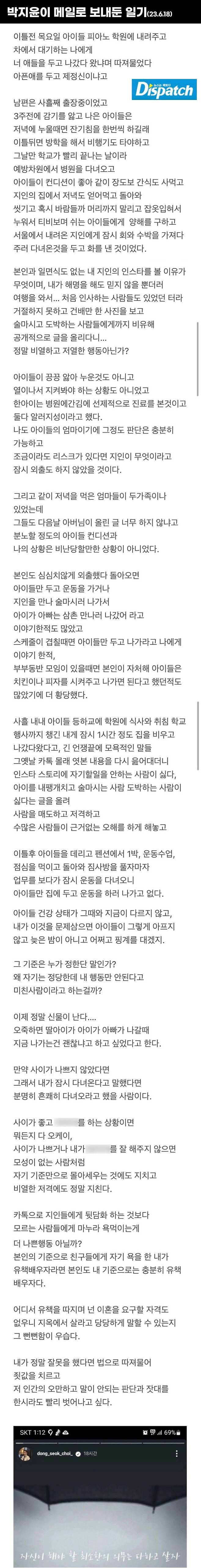 "생일 당일(4일)을 함께 보내진 못했습니다. 저는 일정이 있어 서울로 갔고, 친한 동생에게 아이들을 부탁했습니다. 이를 질타하시면 달게 받겠습니다. 그러나 최동석 씨의 공개 저격은... 더이상 말하지 않겠습니다." (박지윤)