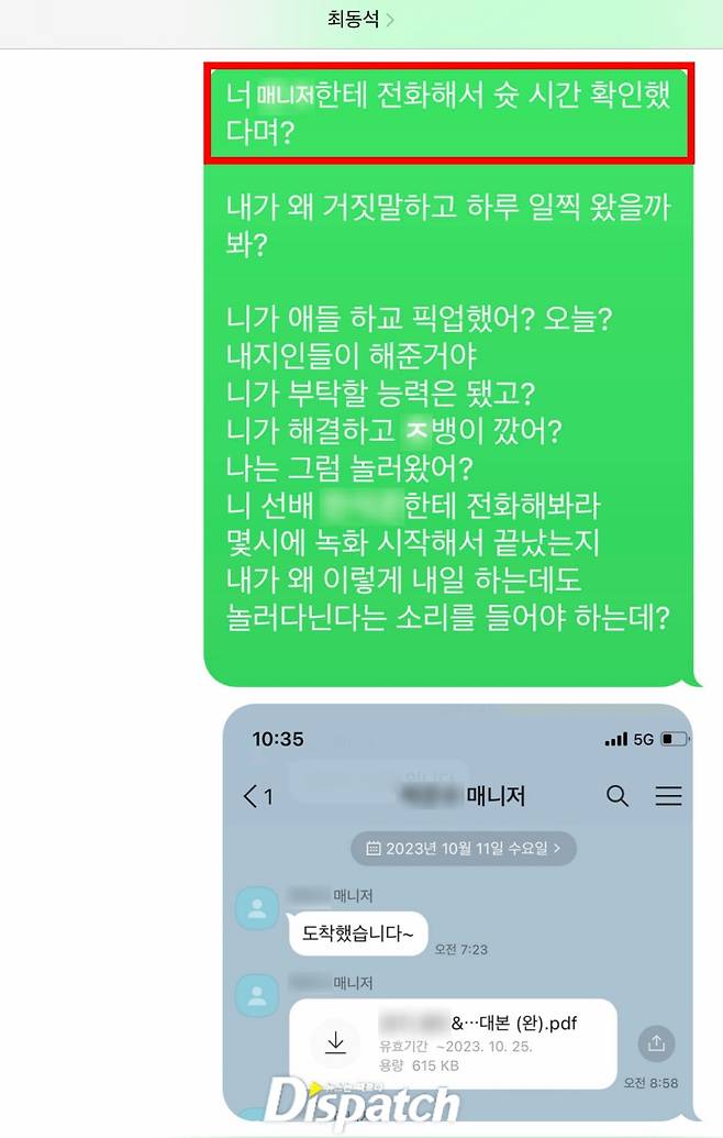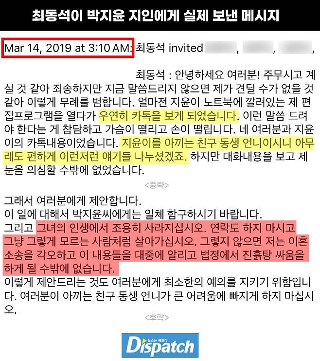 '디스패치'는 그날(5월 7일), 최동석과 장인이 나눈 문자를 통해 전후 사정을 알 수 있었다.