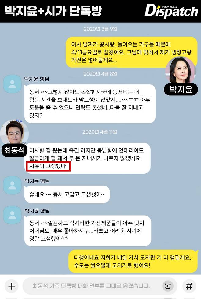최동석 형 부부도 박지윤에게 감사 인사를 전했다. "동서 고맙고 고생했어", "깔끔하고 럭셔리한 가전제품 멋져“등의 말을 남겼다. 하지만, 그때는 맞고 지금은 틀리다. 2020년 최동석은 “지윤아 고생했다“고 말했다. 2024년 최동석은 압구정 아파트에 가압류(18억 원)를 걸어 놓은 상태. 재산분할 소송에서 자신의 권리를 주장하기 위한 조치로 보인다.